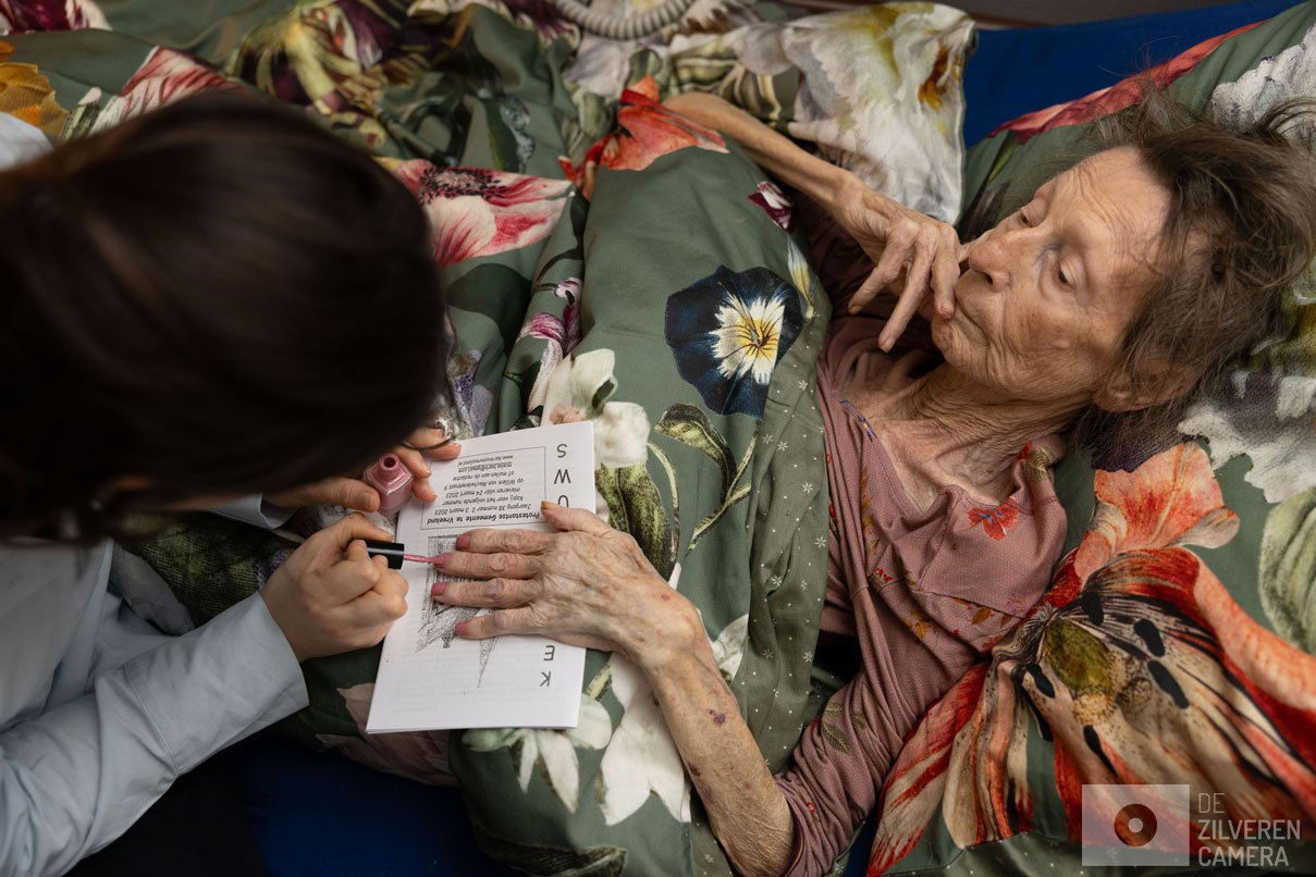 Kan iedereen wel sterven zoals hij of zij dat wil? De moeder van de fotograaf overleed op 23 maart 2023 aan uitgezaaide borstkanker. “Ze wilde het liefst thuis sterven en dat is gelukt. Maar dat ging niet zomaar. De inzet van haar buurvrouw en diverse mantelzorgers was cruciaal. Het was heel veel werk, bijna te veel. Mams doodgaan was zowel voor haar als voor mij een ingewikkelde puzzel waarvoor geen eenduidige oplossing bestond”, zegt de fotograaf. Deze serie laat het sterfproces zien – vastgelegd met medeweten van de moeder.