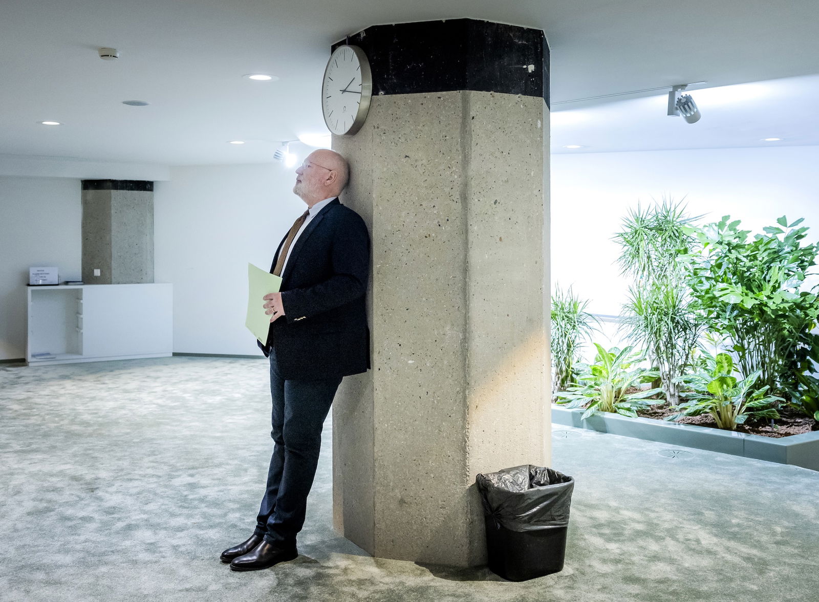 WANDELGANG | Frans Timmermans (GroenLinks-PvdA) leunt in de wandelgang tegen een pilaar voorafgaand aan zijn inbreng tijdens het wekelijkse vragenuurtje in de Tweede Kamer.